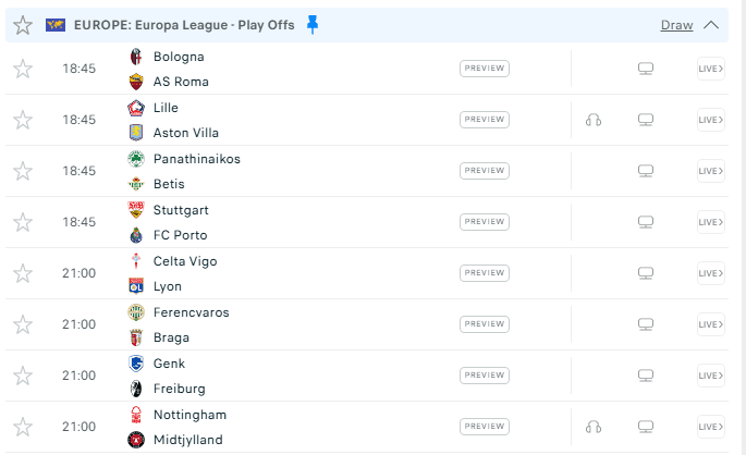 Ndeshjet nisin nga ora 18:45, ku në program është edhe një nga përballjet më tërheqëse të mbrëmjes mes Lille OSC dhe Aston Villa.