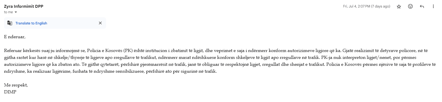 “Gjatë realizimit të detyrave policore, në të gjitha rastet kur haset në shkelje të ligjeve apo rregullave të trafikut, ndërmerren masat ndëshkuese. Të gjithë pjesëmarrësit në trafik janë të obliguar të respektojnë ligjet, rregullat dhe shenjat e trafikut”, thuhet në përgjigjen e tyre.