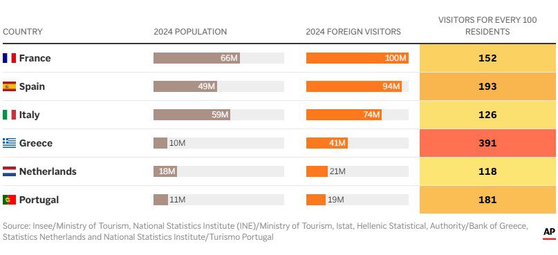 747 milionë vizitorë ndërkombëtarë mbërritën në kontinent gjatë vitit 2024, duke e bërë atë destinacionin më të vizituar në botë. Më shumë se 70% e tyre u përqendruan në vendet e Europës Jugore dhe Perëndimore – si Spanja, Franca, Italia dhe Greqia – duke shtuar presion të jashtëzakonshëm mbi infrastrukturën, banesat, burimet natyrore dhe vetë jetën e përditshme të banorëve.