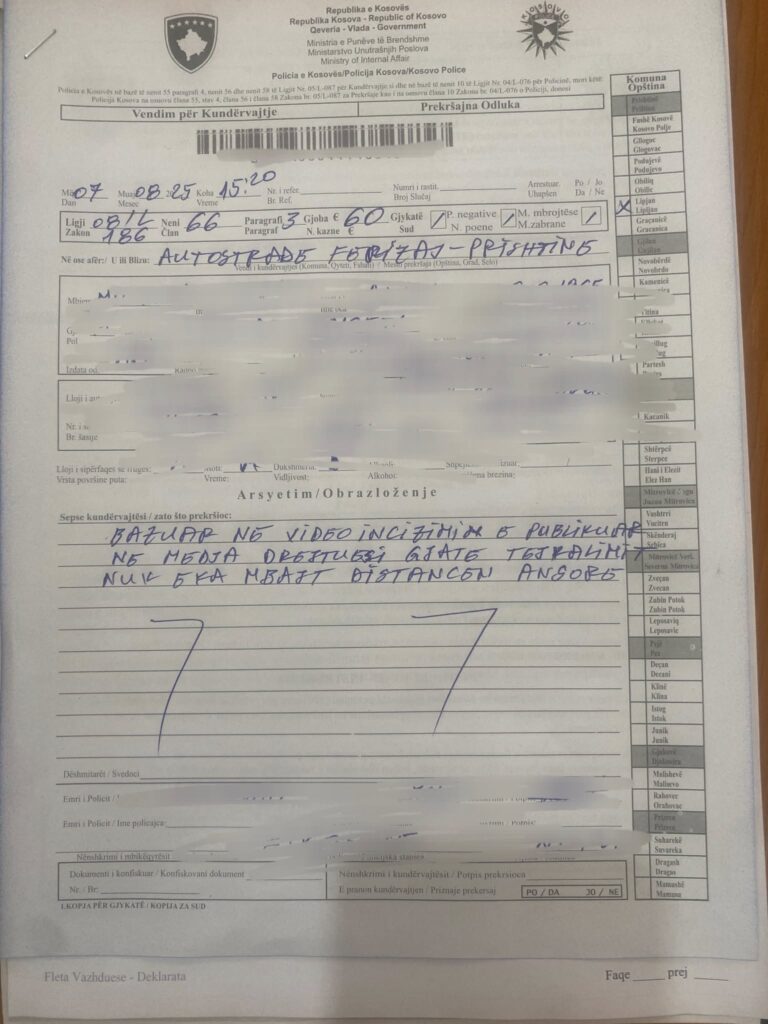 Në bazë të pamjeve të siguruara, është arritur të identifikohen dy drejtues mjetesh të cilët kanë shkelur rregullat e qarkullimit rrugor. Njëri prej tyre është ndëshkuar me gjobë prej 60 euro, pasi nuk kishte mbajtur distancën anësore të sigurisë gjatë tejkalimit, duke rrezikuar sigurinë e pjesëmarrësve të tjerë në trafik.