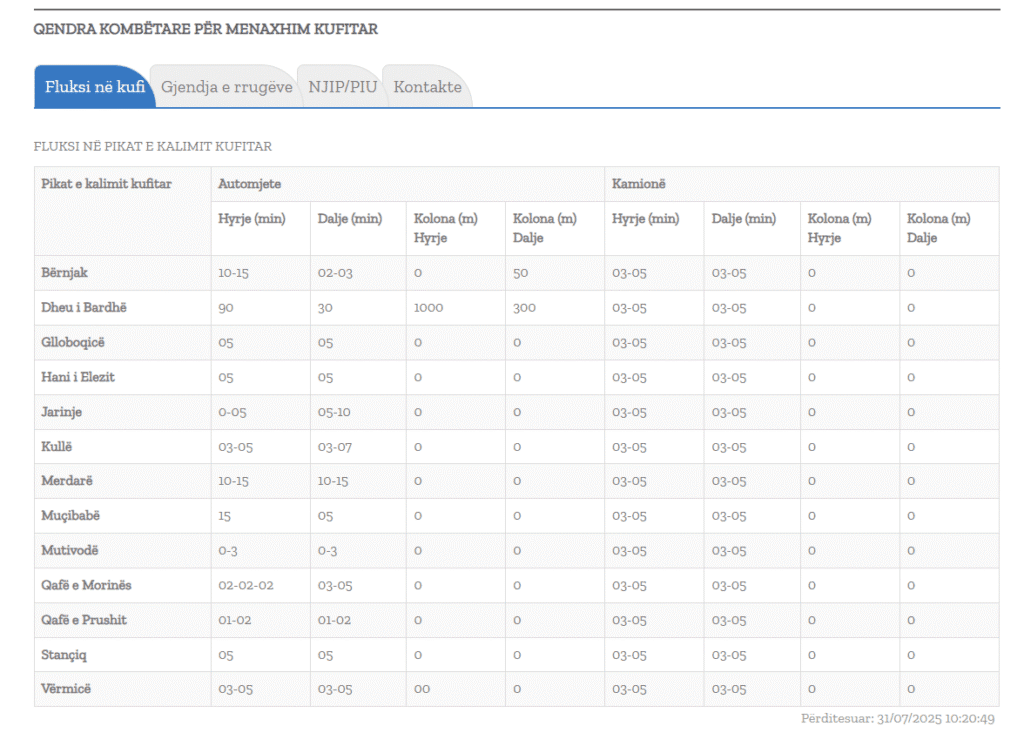 Qendra Kombëtare për Menaxhim Kufitar ka publikuar të dhënat më të fundit mbi fluksin e qarkullimit në pikat kufitare të Kosovës, të përditësuara në orën 10:20 të mëngjesit të sotëm, më 31 korrik 2025, pëcjell AutoPortali.