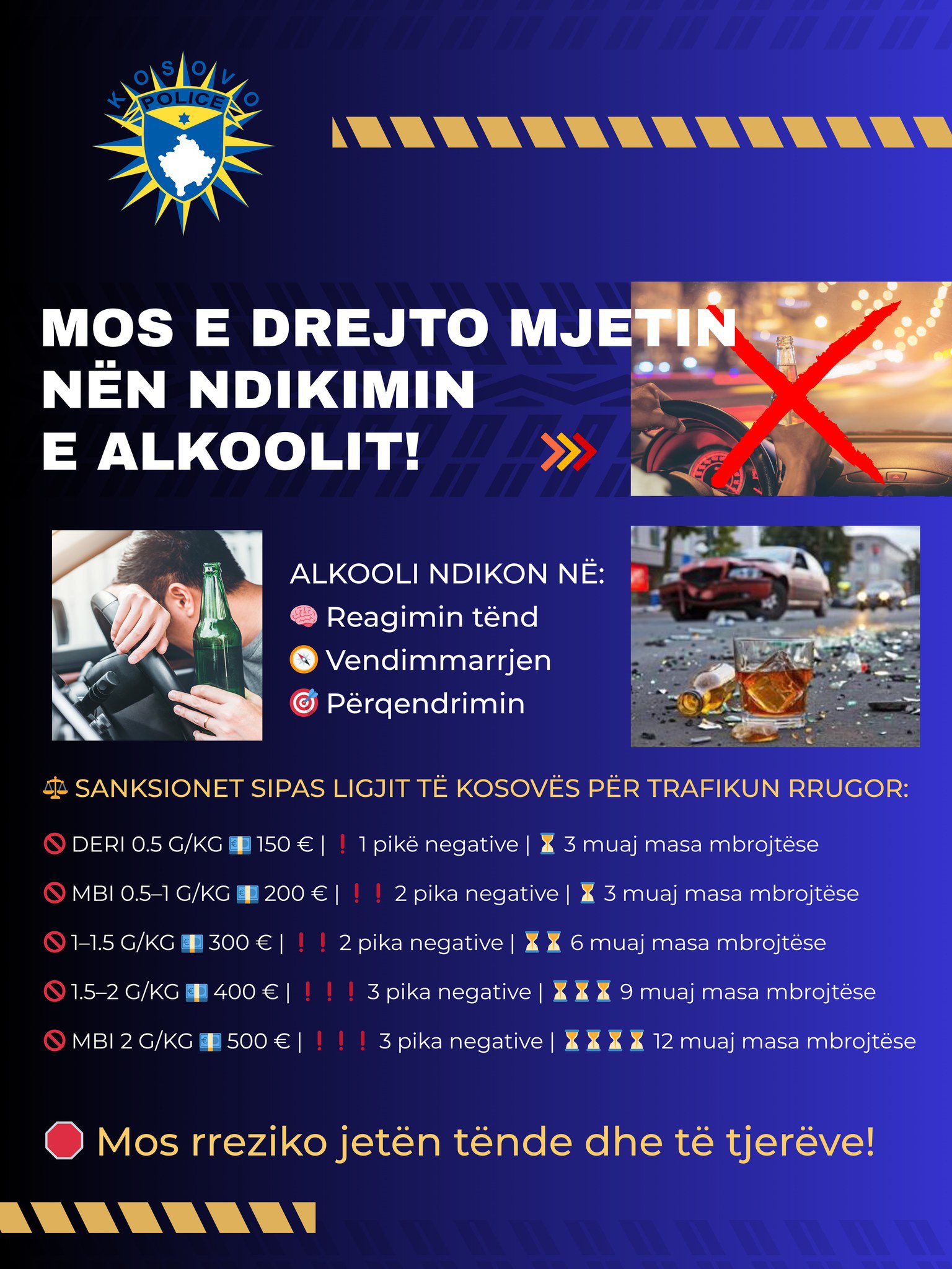 Policia e Kosovës ka intensifikuar fushatën vetëdijësuese kundër drejtimit të automjetit nën ndikimin e alkoolit, me qëllim të rritjes së sigurisë në komunikacion dhe parandalimit të aksidenteve fatale. Përmes një mesazhi të qartë dhe të drejtpërdrejtë, qytetarëve u bëhet thirrje të mos e rrezikojnë jetën e tyre dhe të tjerëve: “Mos e drejto mjetin nën ndikimin e alkoolit!”
