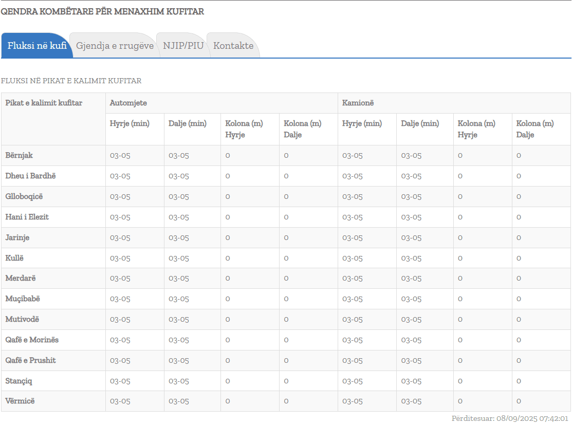 Sipas të dhënave më të fundit nga Qendra Kombëtare për Menaxhim Kufitar, qytetarët që po kalojnë nëpër pikat kufitare të Kosovës nuk kanë pritje të gjata.