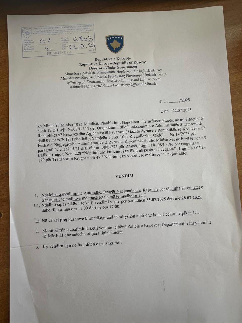 Për shkak të temperaturave të larta që po mbretërojnë në vend, Ministria e Infrastrukturës ka marrë vendim për ndalimin e përkohshëm të qarkullimit të automjeteve me peshë mbi 15 tonë në autoudhë, rrugë nacionale dhe rajonale.