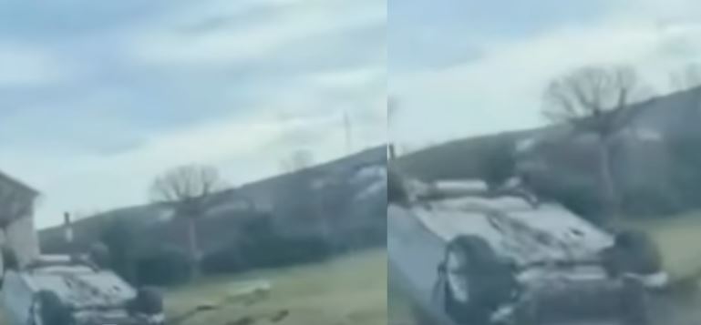 Bazuar në pamjet e publikuara, një veturë ka përfunduar e rrokullisur anash rrugës.