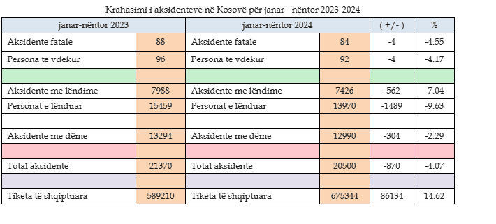 Sipas statistkave të lëshuara nga Policia e Kosovës gjatë viti 2024 janë raportuar 88 aksidente fatale me marrje jete të 96 personave, aksidente me lëndime 7988 me mbi 15 mijë persona të lënduar.