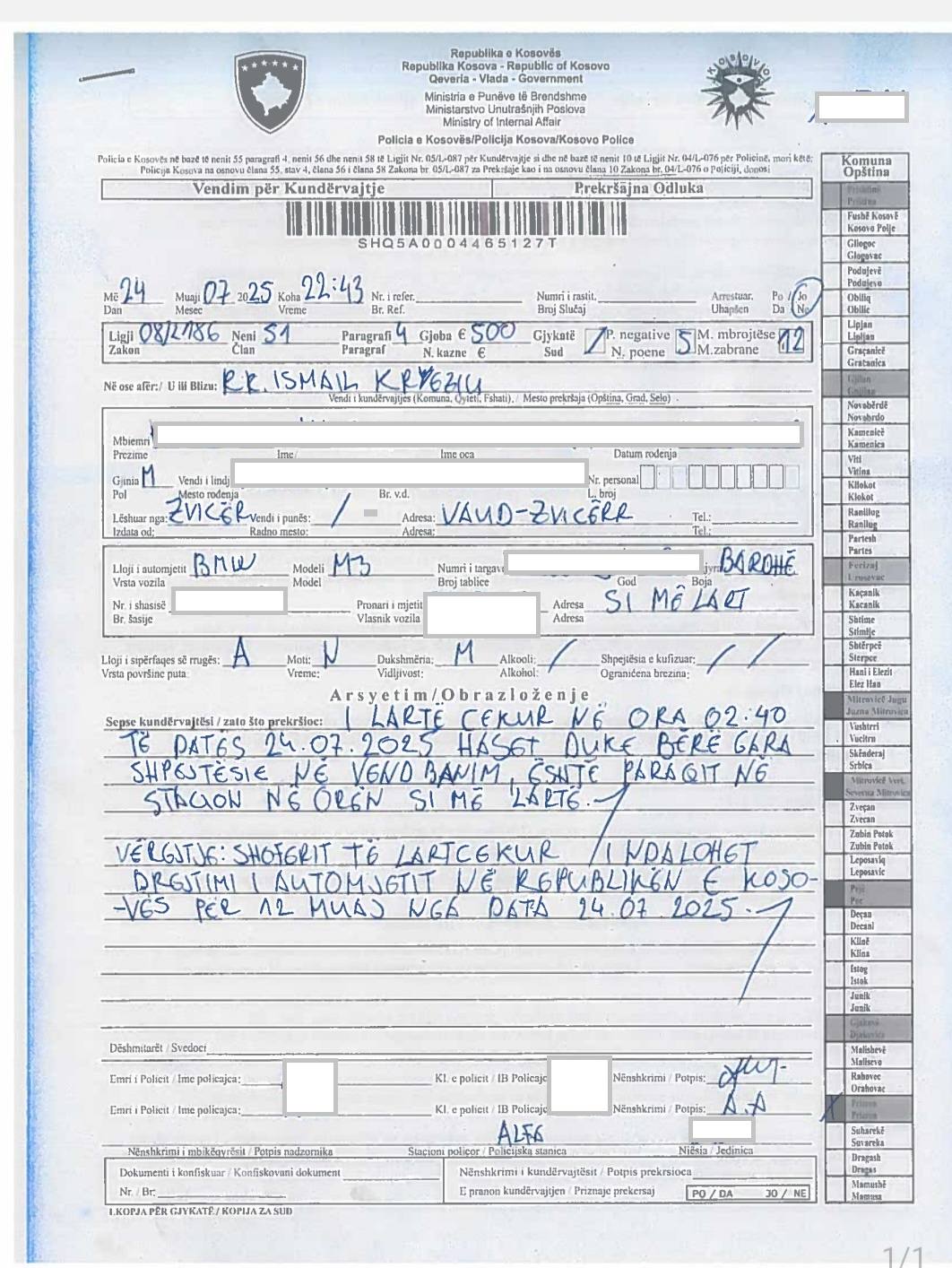 Ngjarja ka ndodhur më 24 korrik rreth orës 02:50 në një rrugë të qytetit të Prizrenit. Fillimisht, secilit prej tyre i ishte shqiptuar një gjobë prej 500 eurosh dhe masa ndaluese për drejtimin e automjetit për 12 muaj, shkruan AutoPortali.