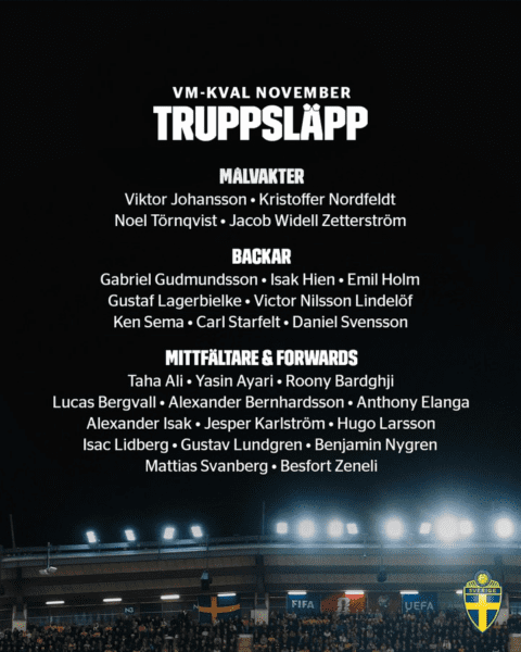 Kombëtarja e Suedisë ka publikuar listën e futbollistëve të ftuar për dy ndeshjet e muajit nëntor në kuadër të kualifikimeve për Kampionatin Botëror 2026.