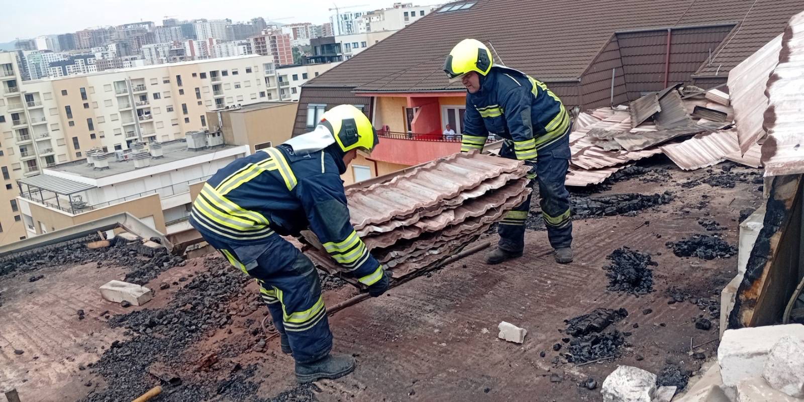 Erërat e forta kanë shkaktuar rënien e pjesëve të djegura nga kulmi i ndërtesës, duke rrezikuar zonën përreth kompleksit banesor.