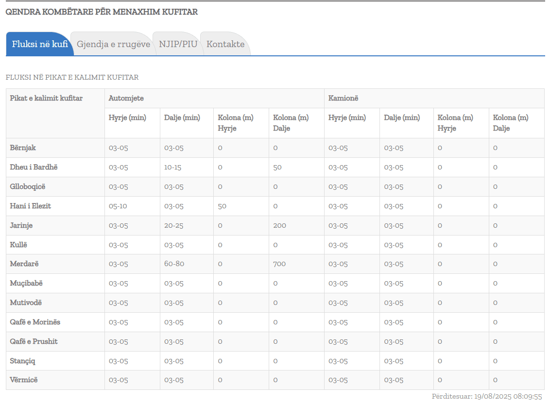 Ndërkaq, në pikat e tjera kufitare si Bërnjak, Glloboçicë, Kullë, Qafë e Morinës, Qafë e Prushit, Stançiq dhe Vërmicë, pritjet janë minimale, duke mos kaluar më shumë se 5 minuta.