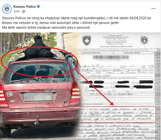 Sipas njoftimit të Policisë së Kosovës, i dyshuari ka qenë duke drejtuar automjetin e tij në momentin kur mbi veturë ishte i shtrirë një person tjetër. Ky veprim konsiderohet jashtëzakonisht i rrezikshëm dhe në kundërshtim me rregullat e sigurisë në trafik, përcjell AutoPortali.