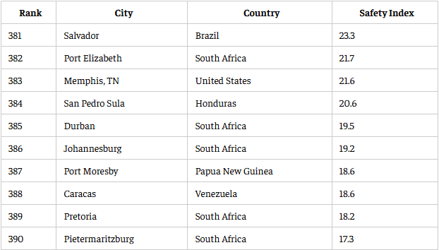 Pietermaritzburg në Afrikën e Jugut zë vendin e fundit me një indeks sigurie prej vetëm 17.3. Pas saj vjen Pretoria me 18.2, ndërsa Caracas (Venezuelë) dhe Port Moresby (Papua Guinea e Re) ndajnë të njëjtin indeks prej 18.6. Të dhënat pasqyrojnë një ndjenjë të thellë pasigurie mes banorëve për shkak të krimeve, dhunës së bandave dhe pranisë së dobët të forcave të rendit.