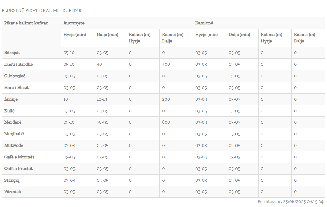 Në Merdarë, pritjet për dalje me automjete arrijnë deri në 70–90 minuta, ndërsa kolona shtrihet rreth 600 metra. Situatë e ngjashme edhe në pikën kufitare të Dheut të Bardhë, ku pritjet shkojnë deri në 40 minuta dhe kolona ka arritur në 400 metra.