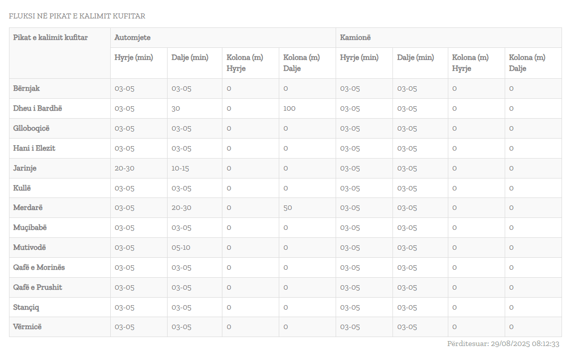 Në pikën kufitare Dheu i Bardhë, pritjet për automjete arrijnë deri në 30 minuta, ndërsa kolona në dalje është rreth 100 metra. Situatë e ngjashme paraqitet edhe në Merdarë, ku koha e pritjes në dalje është 20 deri në 30 minuta, me kolonë prej 50 metrash.