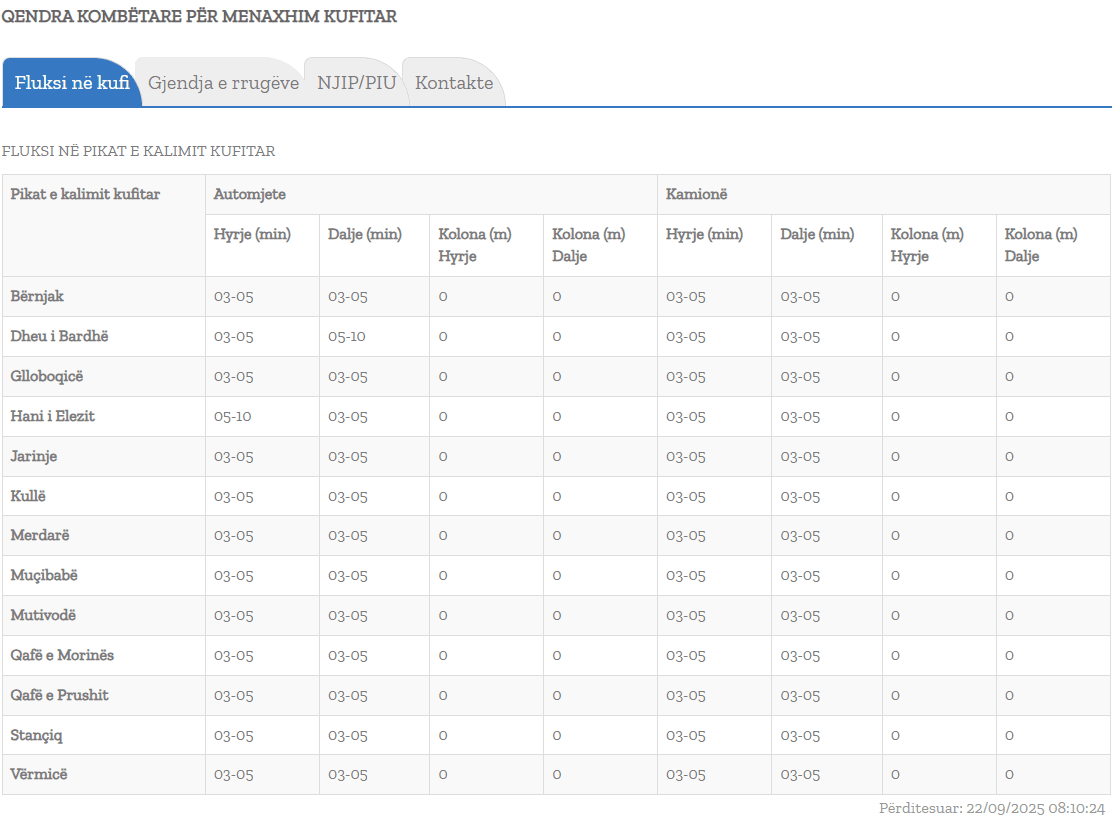 Sipas të dhënave të publikuara nga Qendra Kombëtare për Menaxhimin Kufitar në orën 08:10 të mëngjesit, koha e pritjes për hyrje dhe dalje është vetëm 3 deri në 5 minuta për automjete dhe kamionë, përcjell AutoPortali.