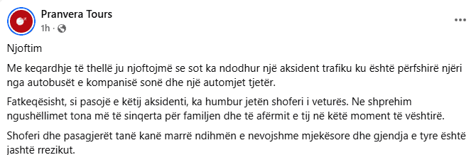 Reagon kompania e autobusit pas aksidentit tragjik në KlinëR Reagon kompania e autobusit pas aksidentit tragjik në Klinë 21.8.2025 11:28 Mëngjesin e së enjtes, një person ka vdekur dhe pesë të tjerë janë lënduar si pasojë e një aksidenti që ka ndodhur në Gjurgjevik të Madh të Klinës. Aksidenti ka ndodhur mes një veture dhe autobusi, raporton AutoPortali. Kompania turistike “Pranvera Tours” ka shprehur ngushëllimet për familjarët e viktimës. Sipas njoftimit të kompanisë, gjendja e shoferit të autobusit dhe e pasagjerëve është jashtë rrezikut për jetë. Aksident i rëndë në Klinë, një i vdekur dhe pesë të lënduar Ndajnë FacebookTwitterWhatsApp TË FUNDIT Toprak Razgatlioglu vlerësohet mirë edhe pa rezultat 13.3.2026 16:05 Rally Kenya: Solberg në krye, Ogier futet në garën për fitore 13.3.2026 15:39 Largohet deponia ilegale në rrugën “Muharrem Fejza”, paralajmërohen masa ndaj ndotësve 13.3.2026 15:30 Gjithçka që duhet të dini për garën në Kinë 13.3.2026 14:46