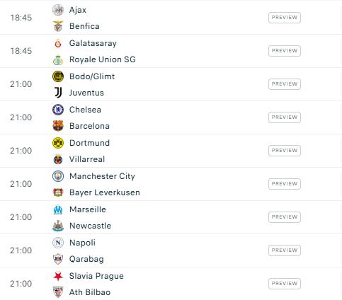 Mbrëmja nis më herët me dy takime: Ajax–Benfica dhe Galatasaray–Union SG, të cilat startojnë në orën 18:00.