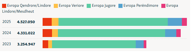 Megjithatë numri më i madh i vizitorëve të huaj në Shqipëri, rreth 95 për qind, janë nga Evropa – me Kosovën që, ndër vite, ka mbetur burimi më i madh i turistëve të huaj në Shqipëri.