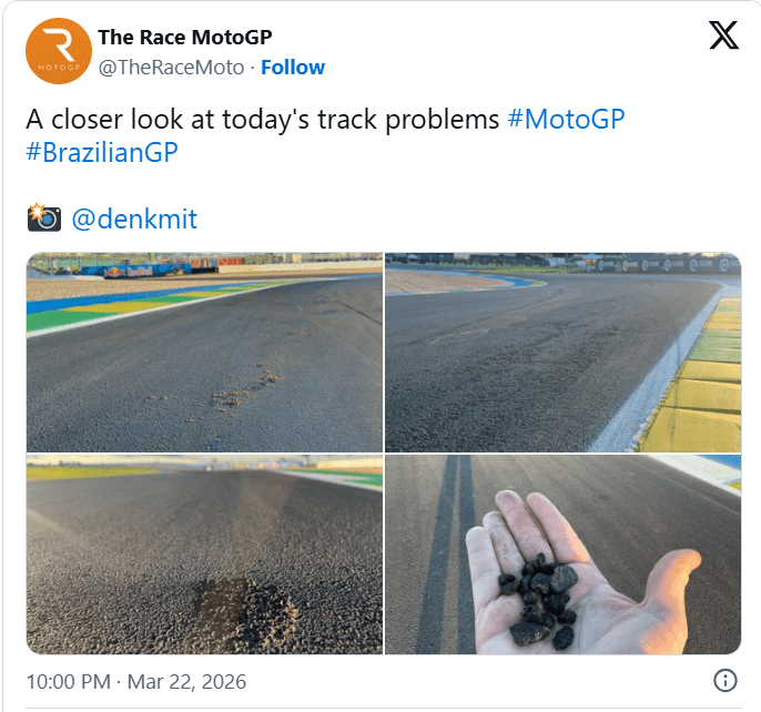 Rikthimi i MotoGP në Brazil u shoqërua me probleme serioze në pistën e Goianias. Pas përmbytjeve dhe një grope të shtunën, të dielën asfalti në kthesën 11 filloi të shpërbëhej, duke hedhur zhavorr që godiste pilotët gjatë garës.